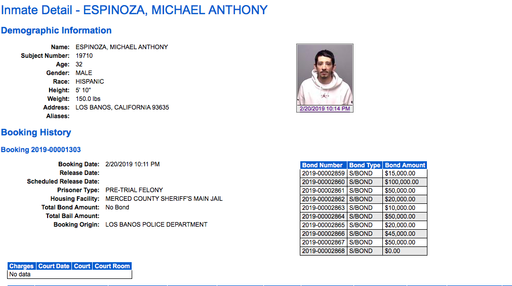 Michael Espinosa remains in custody at the Merced Main Jail under a no bail hold on several felony charges. Some of those charges are; felon in possession of a firearm, possession of an assault weapon, possession of classified controlled substances, felon in possession of ammunition, possession of large capacity magazines, possession of metal knuckles, child endangerment, and possession of cocaine.