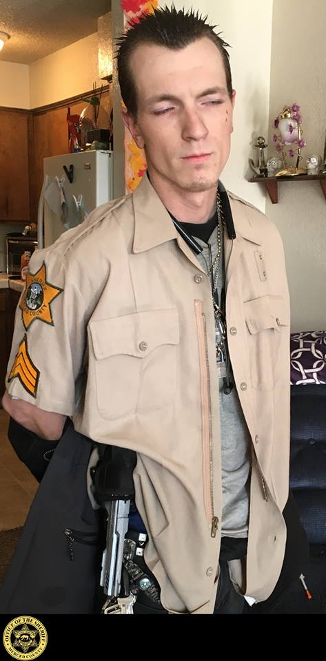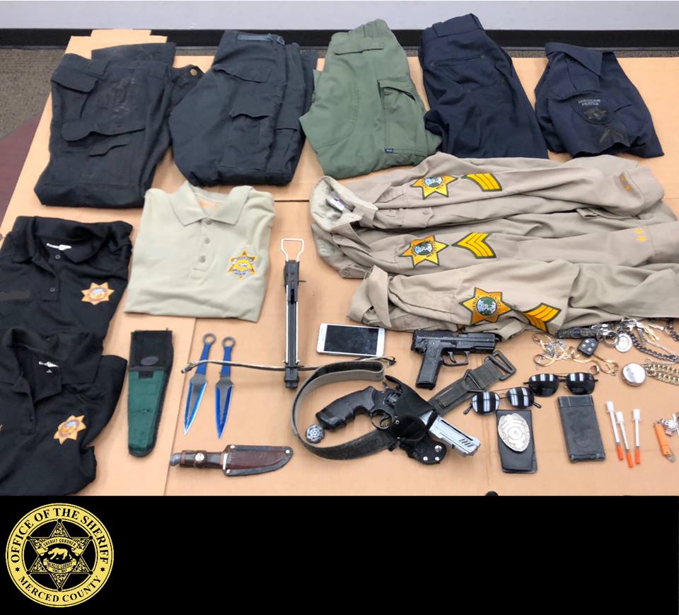 On 11/15/2018 the Merced County Sheriff’s Office Supervise Release Team (SRT) received information of a white male adult who was impersonating a Merced County Sheriff’s Deputy in the 1100 Block of Kelso Drive in Atwater. During the course of this investigation Jeremiah Foster was found in possession of several Merced County Sheriff and Atwater Police Department uniforms and Foster was wearing one of the uniforms and a replica firearm which had been altered to make it look real at the time of his arrest. Foster was also in possession of two replica firearms, a replica tin badge, a crossbow and law enforcement tactical belt. He is on probation and electronic monitor out of San Joaquin County. SRT Deputies arrested Foster for impersonating a peace officer, altering/possession of a replica firearm, and possession of a dirk/dagger.