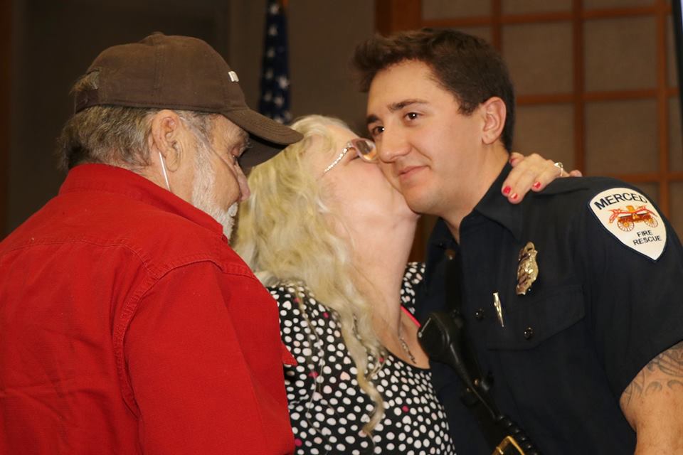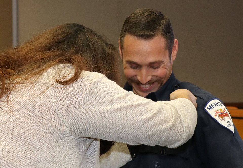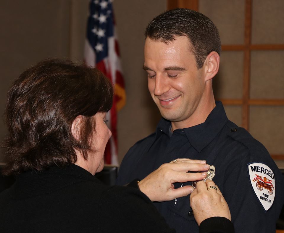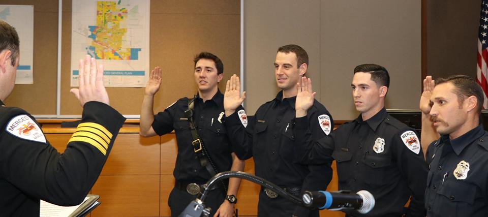 The Merced Fire Department held a badge pinning ceremony for four new firefighters Friday afternoon in ceremonies before family, friends, fellow firefighters and City staff. Acting Chief Billy Alcorn swore in Mickey Brunelli, Daniel Gragg, David Van Noy Reher and Alexander Steindel.