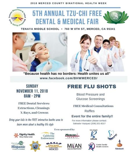 Free dental and medical fair happening in Merced Nov 6, 2018 A free dental and medical fair is happening this Sunday, November 11th, 2018 at Tenaya Middle School in Merced See flyer for more details!