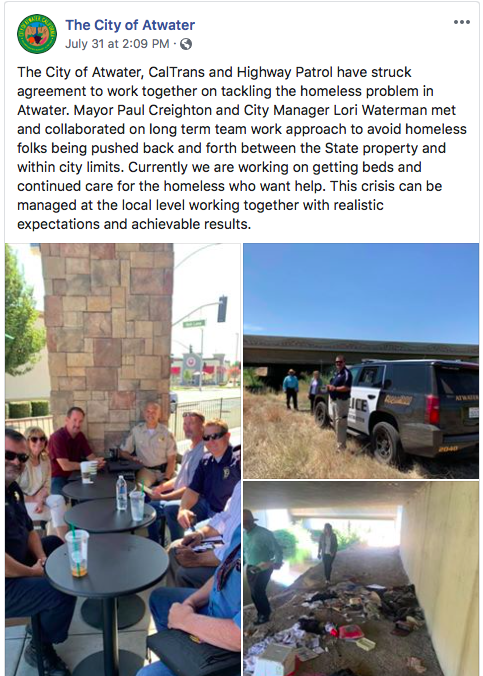 Most recently, Atwater City officials visited several homeless encampments in Atwater. Atwater City officials, CalTrans, and Highway Patrol are working together and are working diligently to help those who want help.